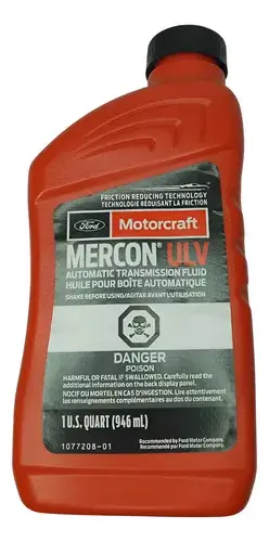 Aceite original Ford Motorcraft Mercon ULV (Ultra Low Viscosity), formulado especialmente para transmisiones automáticas de última generación. Su baja viscosidad mejora la eficiencia energética, reduce la fricción, protege contra el desgaste y prolonga la vida útil de la transmisión, cumpliendo con los más altos estándares de calidad de Ford.